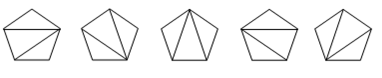 问题的提出:在一个凸n边形中,通过不相交于n边形内部的对角线,把n边形拆分成若干三角形,不同的拆分数目用hn表示,hn即为Catalan数。例如五边形有如下五种拆分方案,故h5=5。求对于一个任意的凸n边形相应的hn。