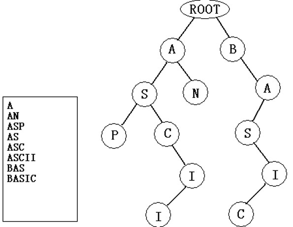 在进行文法分析的时候,通常需要检测一个单词是否在我们的单词列表里。为了提高查找和定位的速度,通常都画出与单词列表所对应的单词查找树,其特点如下: