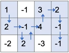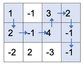 按上述走法,取到的数之和为 1 + 2 + (-1) + 4 + 3 + 2 + (-1) + (-1) = 9,可以证明为最大值。