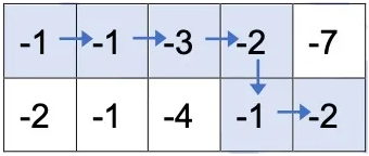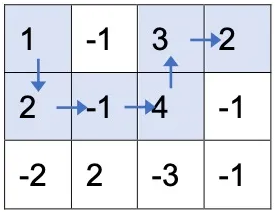 按上述走法,取到的数之和为(-1) + (-1) + (-3) + (-2) + (-1) + (-2) = -10,可以证明为最大值。因此,请注意,取到的数之和的最大值也可能是负数。