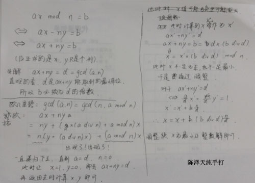 在欧几里德推广算法的基础上,我们可得同余方程ax≡b(mod n)的求解过程如下: