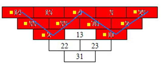 这是一个技能树(或者科技树).格子上的数,是威力值.要先学会第一排第二个和第三个,才能学会第二排的第二个.每个技能学习的前提都是左上和右上的两个技能.假设现在有一个第一层有N个技能的技能树,而且技能点是有限的,只能学习M个技能,我们想知道最大的威力值之和是多少。