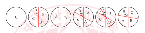 - 设你一共切了 n 刀,那么你将得到 2n 个扇形的蛋糕(特别地,切了 0 刀被认为是有一个扇形,即整个圆形蛋糕),将这些蛋糕分配给 Alice,Bob 和 Cindy,要求每个扇形蛋糕只能完整地分给个人。