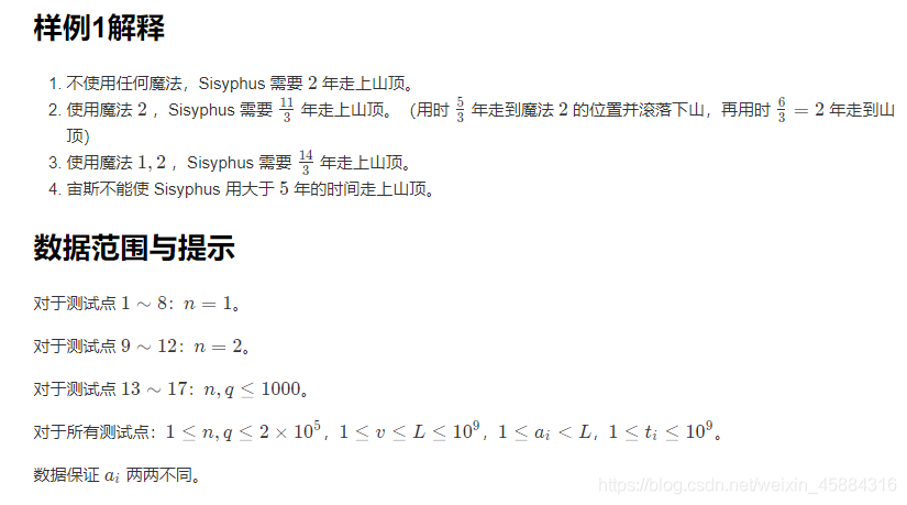 宙斯命 Sisyphus 推一块巨石上长度为 L的山坡。Sisyphus 匀速向上推的速度为每年 v 的长度(由于是匀速,故经过1/2年将能向上推 1/2的长度)。然而,宙斯并不希望 Sisyphus 太快到达山顶。宙斯可以施展 n 个魔法,若宙斯施展第 i个魔法(1≤i≤n),则当 Sisyphus 第一次到达位置 ai时,他将会同巨石一起滚落下山底,并从头推起。(滚落的时间忽略不计,即可看作第一次到达位置 ai后 Sisyphus 立即从山底重新出发)
