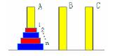 A、B、C 是3个塔座。开始时,在塔座A 上有一叠共n 个圆盘,这些圆盘自下而上,由大到小地叠在一起。各圆盘从小到大编号为1,2,……,n,奇数号圆盘着蓝色,偶数号圆盘着红色,如图所示。现要求将塔座A 上的这一叠圆盘移到塔座B 上,并仍按同样顺序叠置。在移动圆盘时应遵守以下移动规则: