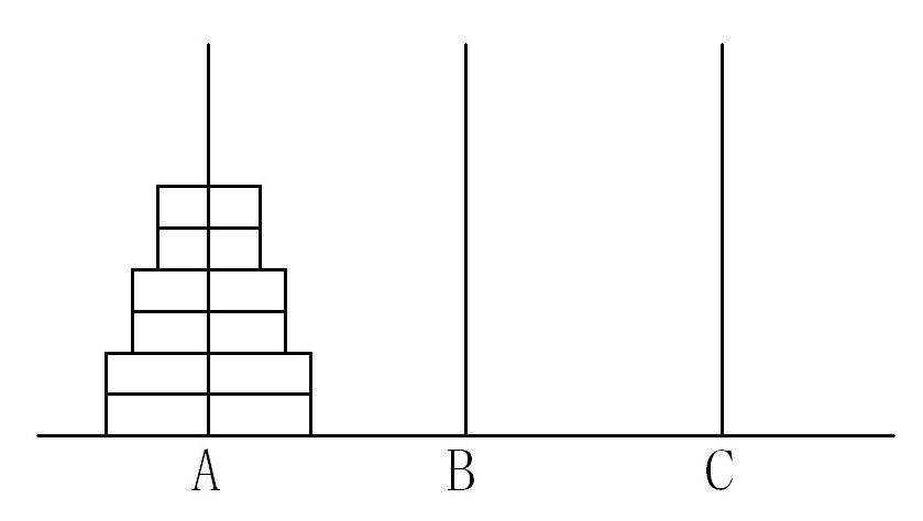 给定A、B、C三根足够长的细柱,在A柱上放有2n个中间有孔的圆盘,共有n个不同的尺寸,每个尺寸都有两个相同的圆盘,注意这两个圆盘是不加区分的(下图为n=3的情形)。现要将这些圆盘移到C柱上,在移动过程中可放在B柱上暂存。要求:
