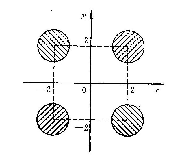 有4个圆塔,圆心分别为(2, 2)、(-2, 2)、(-2, -2)、(2, -2),圆半径为1,如下图所示。这4个塔的高度为10米(m),塔以外无建筑物。