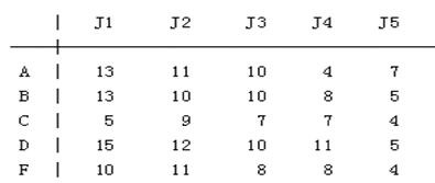 【例5.6】设有A,B,C,D,E五人从事J1,J2,J3,J4,J5五项工作,每人只能从事一项,他们的效益如下。