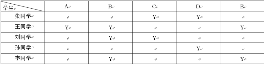 学校放寒假时,信息学竞赛辅导老师有A,B,C,D,E五本书,要分给参加培训的张、王、刘、孙、李五位同学,每人只能选一本书。老师事先让每个人将自己喜欢的书填写在如下的表格中。然后根据他们填写的表来分配书本,希望设计一个程序帮助老师求出所有可能的分配方案,使每个学生都满意。