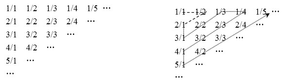 我们以Z字形给上表的每一项编号。第一项是1/1,然后是1/2,2/1,3/1,2/2,…