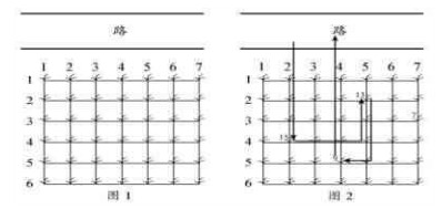 例如在图2所示的花生田里,只有位于(2, 5), (3, 7), (4, 2), (5, 4)的植株下长有花生,个数分别为13, 7, 15, 9。沿着图示的路线,多多在21个单位时间内,最多可以采到37个花生。