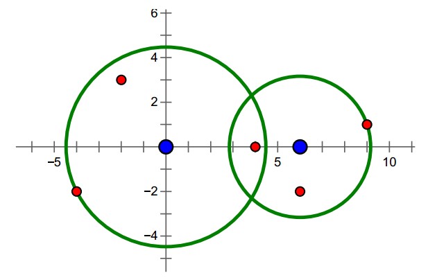 样例中的导弹拦截系统和导弹所在的位置如下图所示。要拦截所有导弹,在满足最小使用代价的前提下,两套系统工作半径的平方分别为20和10。