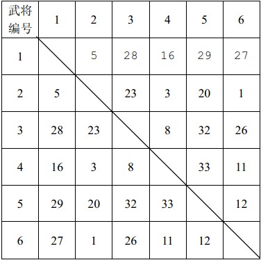 下面举例说明计算机的选将策略,例如,游戏中一共有6个武将,他们相互之间的默契值如下表所示: