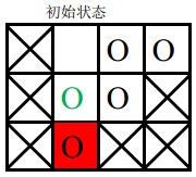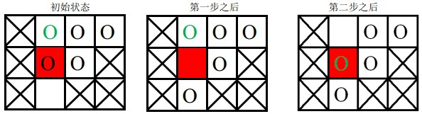 棋盘上划叉的格子是固定的,红色格子是目标位置,圆圈表示棋子,其中绿色圆圈表示目标棋子。