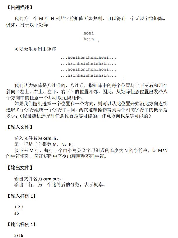 样例一中,一次操作共有 16 种可能,其中得到 aa 的概率是 1/8,得到 ab 的 概率是 3/8,得到 bb 的概率是 1/8,得到 ba 的概率是 3/8。两次操作结果相同的 概率是 5/16。