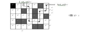 给出一张地图,这张地图被分为n×m(n,m<=100)个方块,任何一个方块不是平地就是高山。平地可以通过,高山则不能。现在你处在地图的(x1,y1)这块平地,问:你至少需要拐几个弯才能到达目的地(x2,y2)?你只能沿着水平和垂直方向的平地上行进,拐弯次数就等于行进方向的改变(从水平到垂直或从垂直到水平)的次数。例如:如图1,最少的拐弯次数为5。