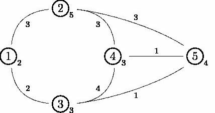 从草地1到草地3的道路的“边过路费”为3,草地2的“点过路费”为5。 要从草地1走到草地4,可以从草地1走到草地3再走到草地5最后抵达草地4。如果这么走的话,需要的“边过路费”为2+1+1=4,需要的点过路费为4(草地5的点过路费最大),所以总的花费为4+4=8。 而从草地2到草地3的最佳路径是从草地2出发,抵达草地5,最后到达草地3。这么走的话,边过路费为3+1=4,点过路费为5,总花费为4+5=9。