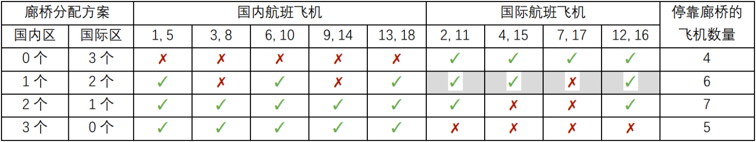 在图中,我们用抵达、离开时刻的数对来代表一架飞机,如 (1, 5) 表示时刻 1抵达、时刻 5 离开的飞机;用 √ 表示该飞机停靠在廊桥,用 × 表示该飞机停靠在远机位。
