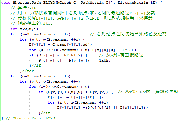 另外需要注意的是,为了更方便的表示顶点间的不可达状态,可以使用一个十分大的值作为标记。而在题目描述中的算法示例使用了另外一个三维数组对其进行表示,这使原本的O(n3)时间复杂度增长到了O(n4),这也是需要自行修改的部分。