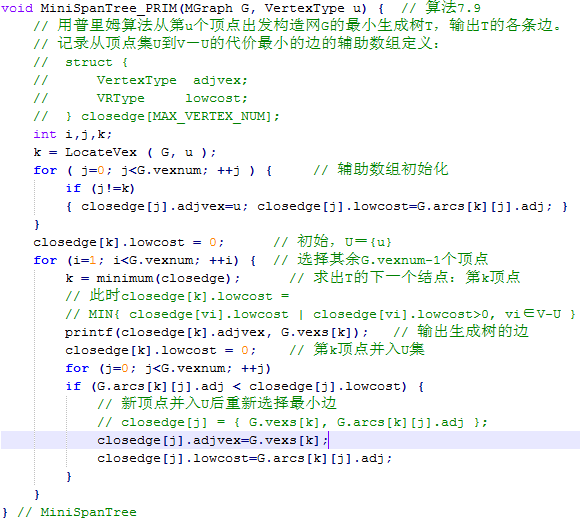 而在常用的最小生成树构造算法中,普里姆(Prim)算法是一种非常常用的算法。以下是其算法的大致结构: